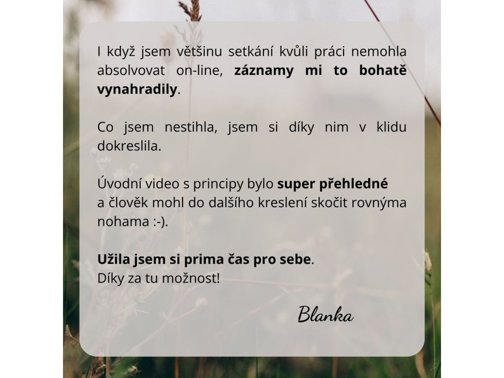 - 90 min skupinového tvoření na Zoomu (nebojte se žádné osobní sdílení).